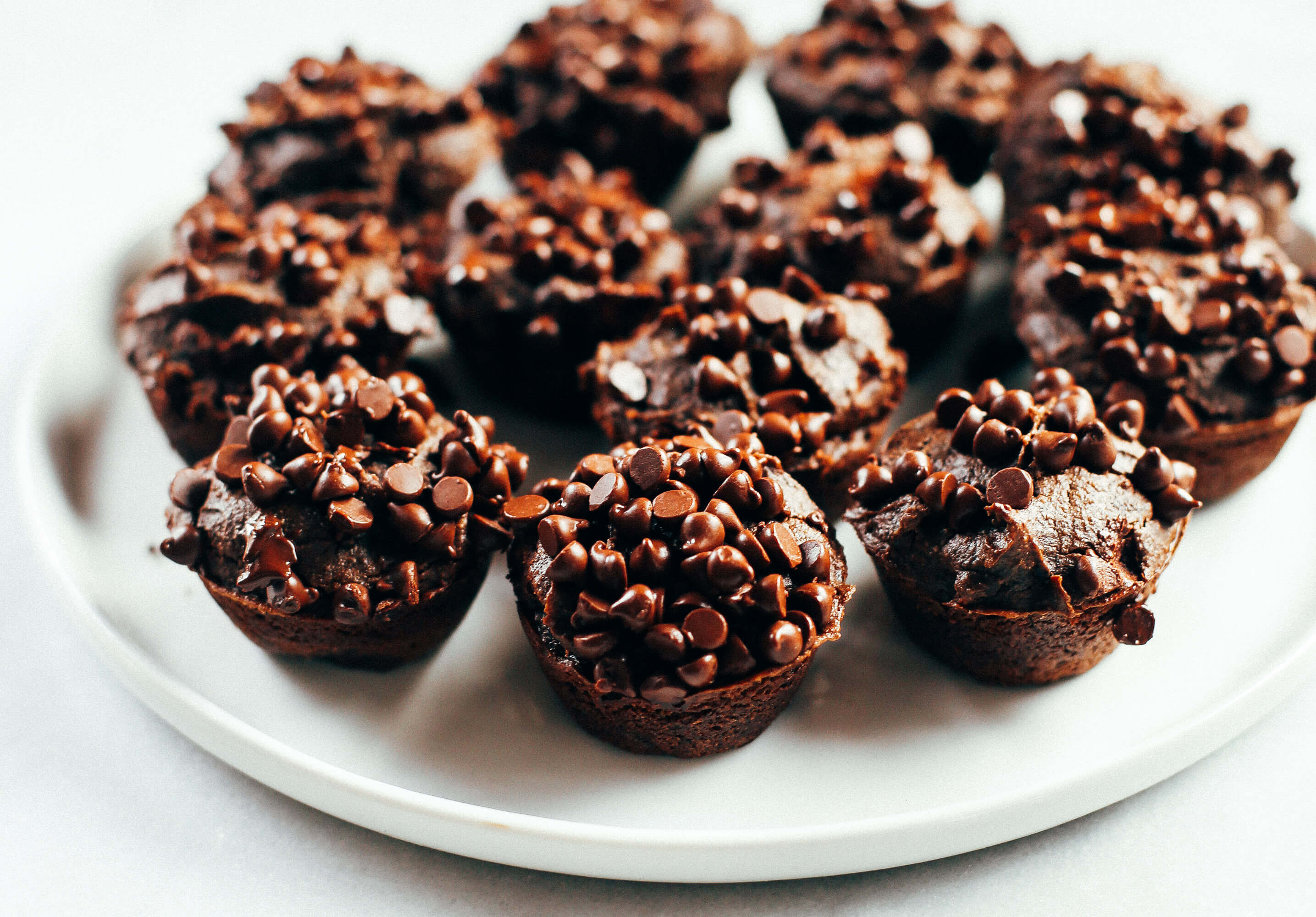 In a food processor blend all ingredients until smooth (except chocolate chips). Use a small ice-cream scoop and fill the muffin pan with batter, then sprinkle with mini chocolate chips (optional) and bake on 350F for 25-30 minutes until a toothpick when inserted to the middle of a muffin comes out clean.