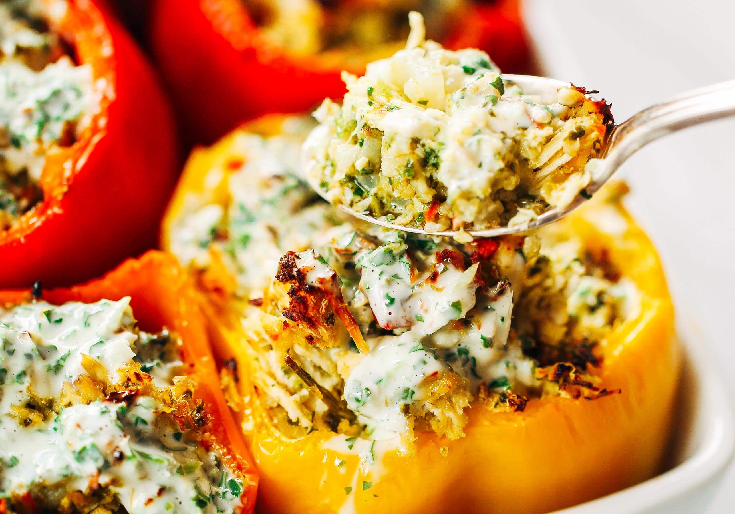 Healthy ranch stuffed bell peppers. A quick whole30 and paleo meal for the whole family! Stuffed with cauliflower rice, shredded chicken, spicy jalapeno and cilantro sauce.