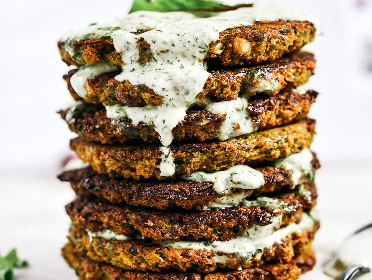 Crispy baked whole30 cauliflower patties with a delicious creamy cilantro garlic sauce. Easy paleo and whole30 recipe for lunch, dinner, and even breakfast if you’re like me!