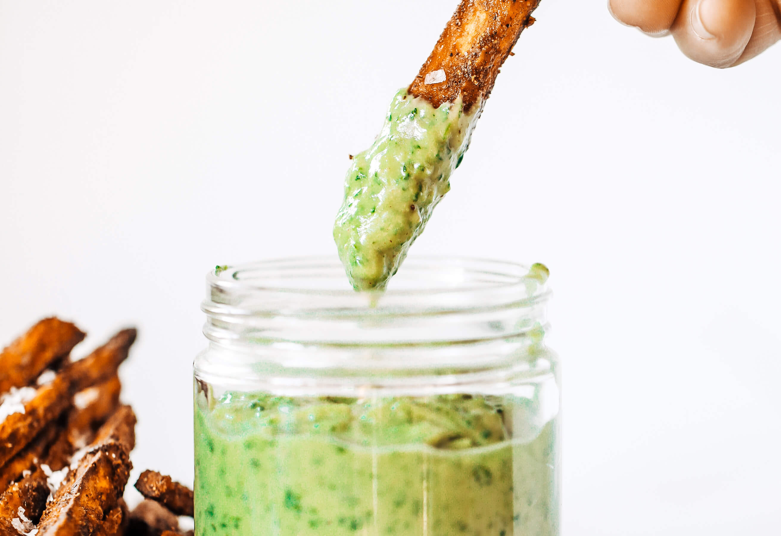 Cumin spiced sweet potato fries are paleo and gluten free. These tasty seasoned fries make the perfect healthy and delicious snack or side dish. This recipe is served with a creamy avocado garlic dipping sauce.