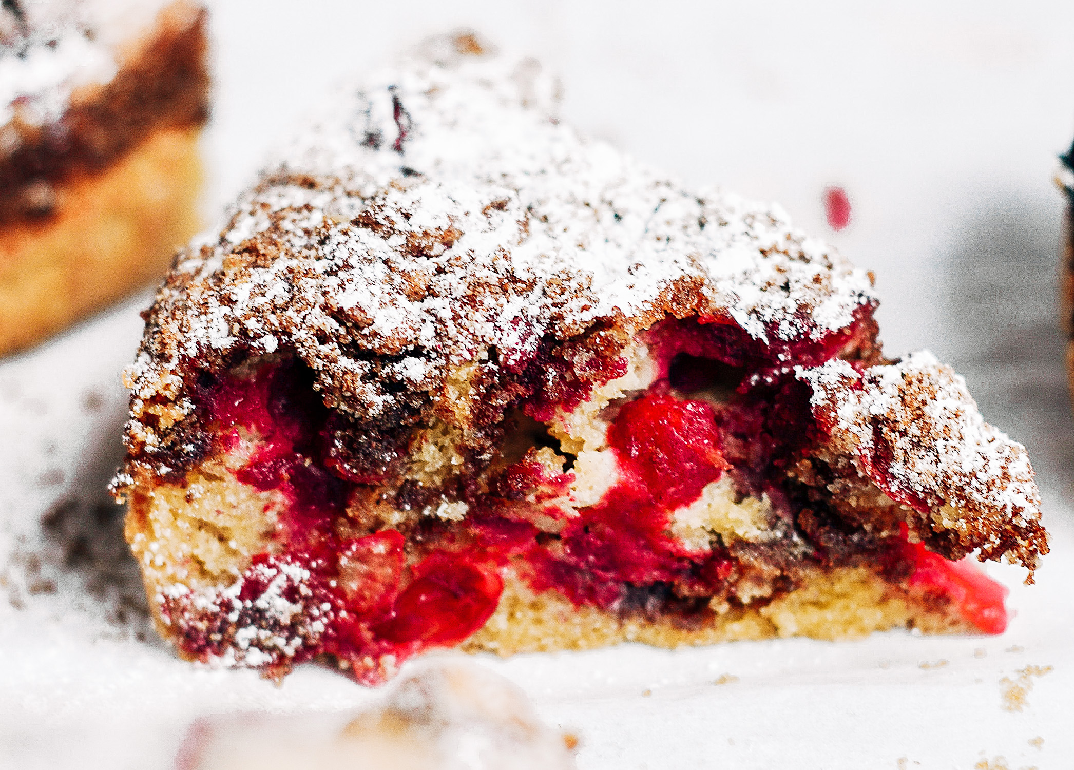 Healthy gluten free paleo coffee cake. Filled with cranberries and topped with the best cinnamon sugar(less) crumble topping known to man (or to me;)! Also dairy free and made in minutes.